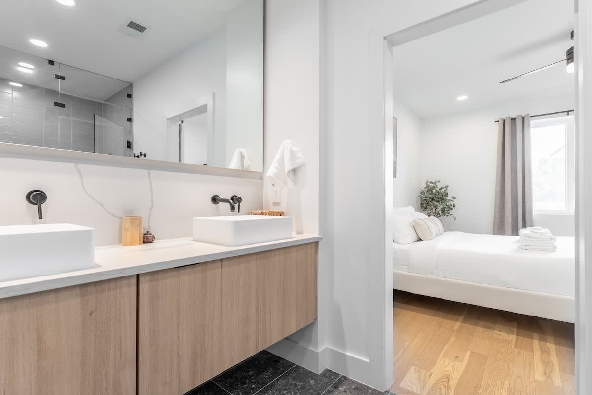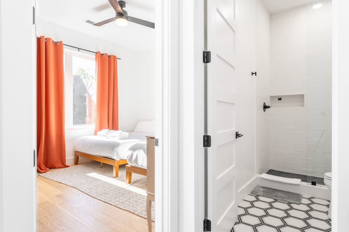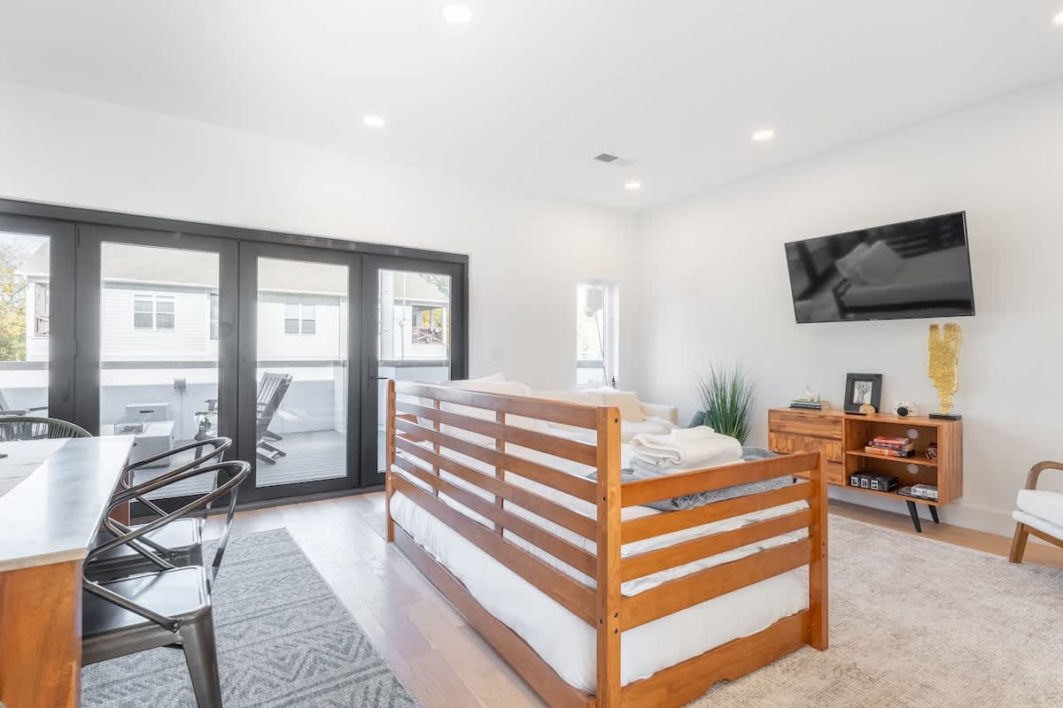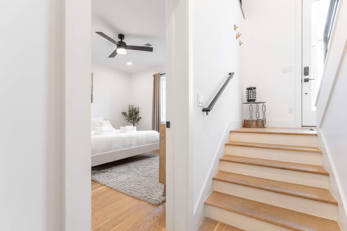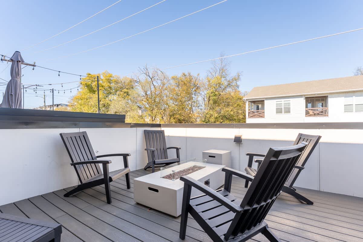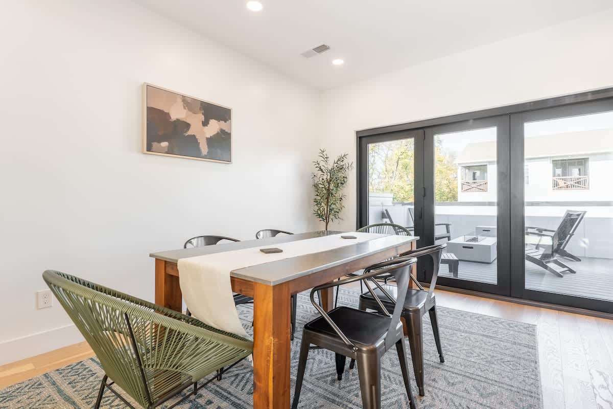 Inside, you’ll find three spacious bedrooms, each with their own private bathroom for the ultimate comfort and privacy. Two feature plush king beds, while the third offers a cozy queen—perfect for families, couples, or groups traveling together. The chic design aesthetic adds warmth and personality throughout the home. The open-concept main floor invites connection, with a sleek chef’s kitchen featuring high-end appliances and a large island that flows seamlessly into the dining and living areas. It’s the perfect setup for cooking, entertaining, or unwinding after a day in the city. Head up to the third level to enjoy a beautiful bonus space and step outside to your private deck for a relaxed evening under the Nashville sky. Fire up the grill, share a meal, or simply take in the view with a glass of wine in hand.