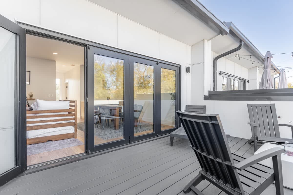 Level Three - stunning bonus space with wet bar, dining table, two twin trundle beds, TV entertainment center, and entrance to a gorgeous private deck