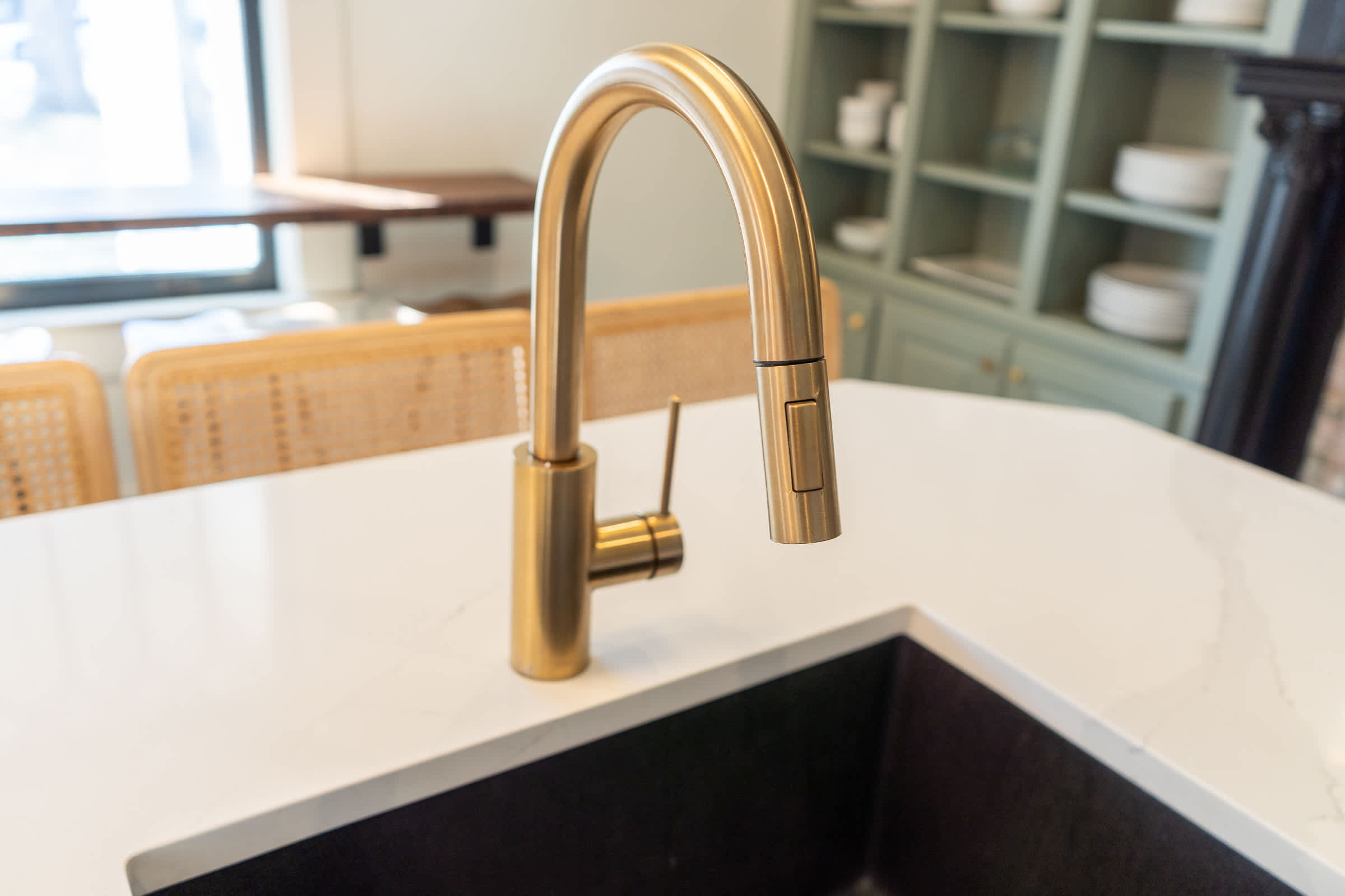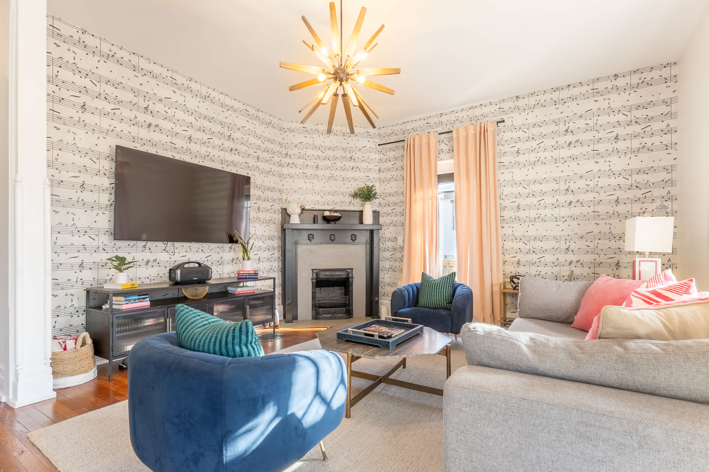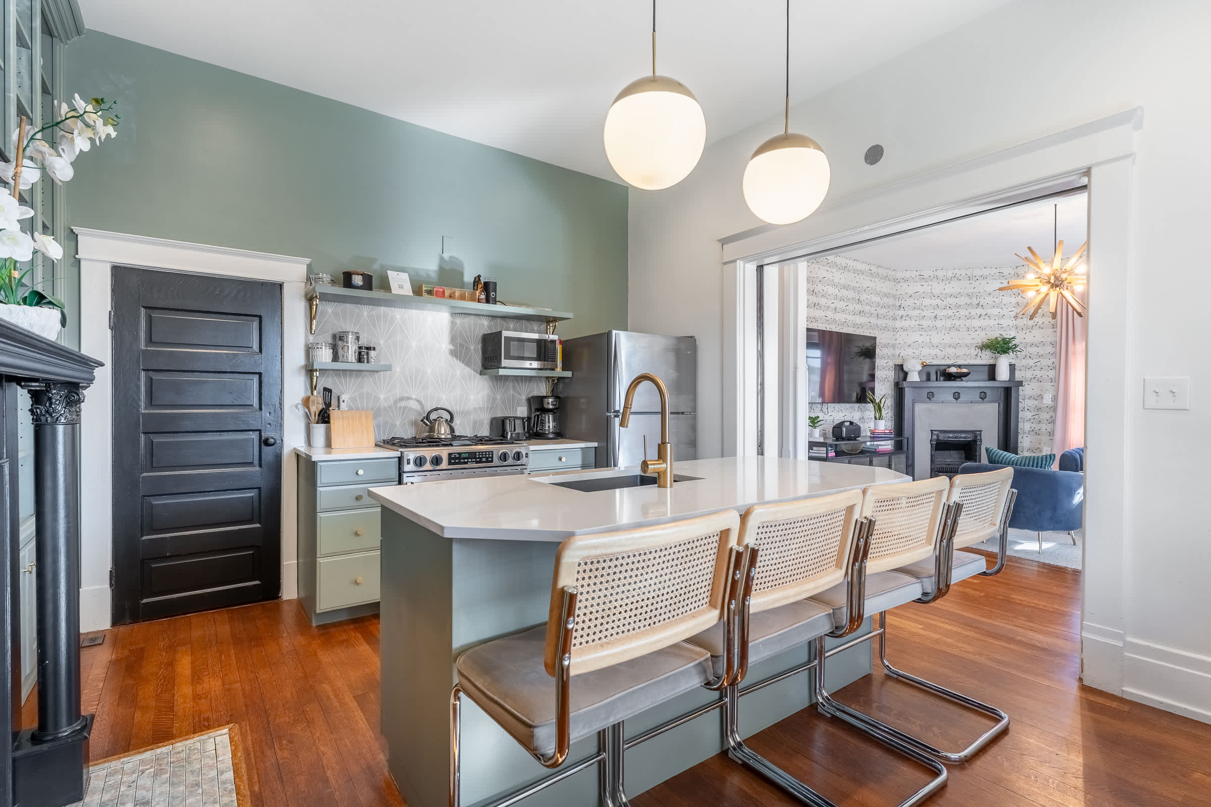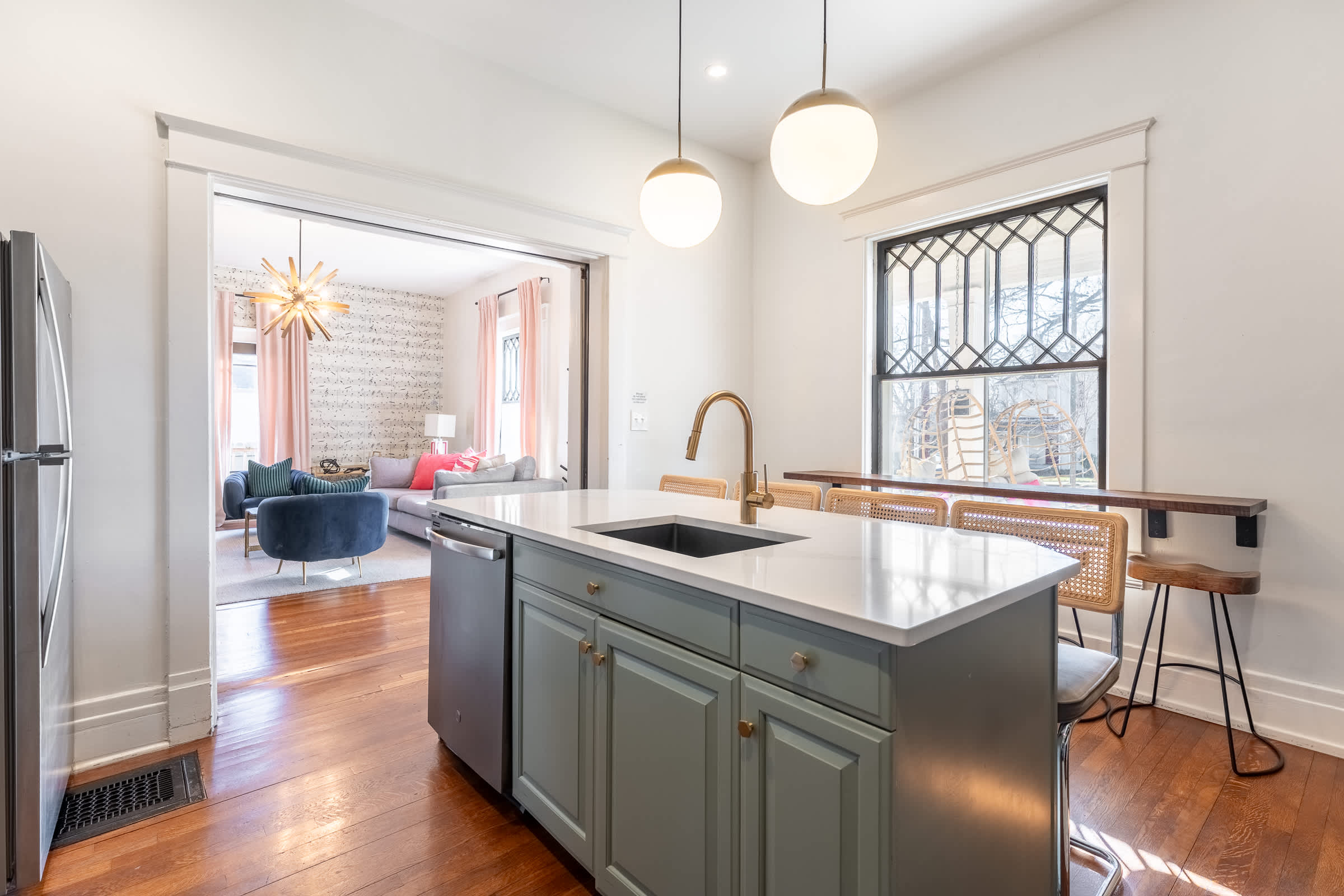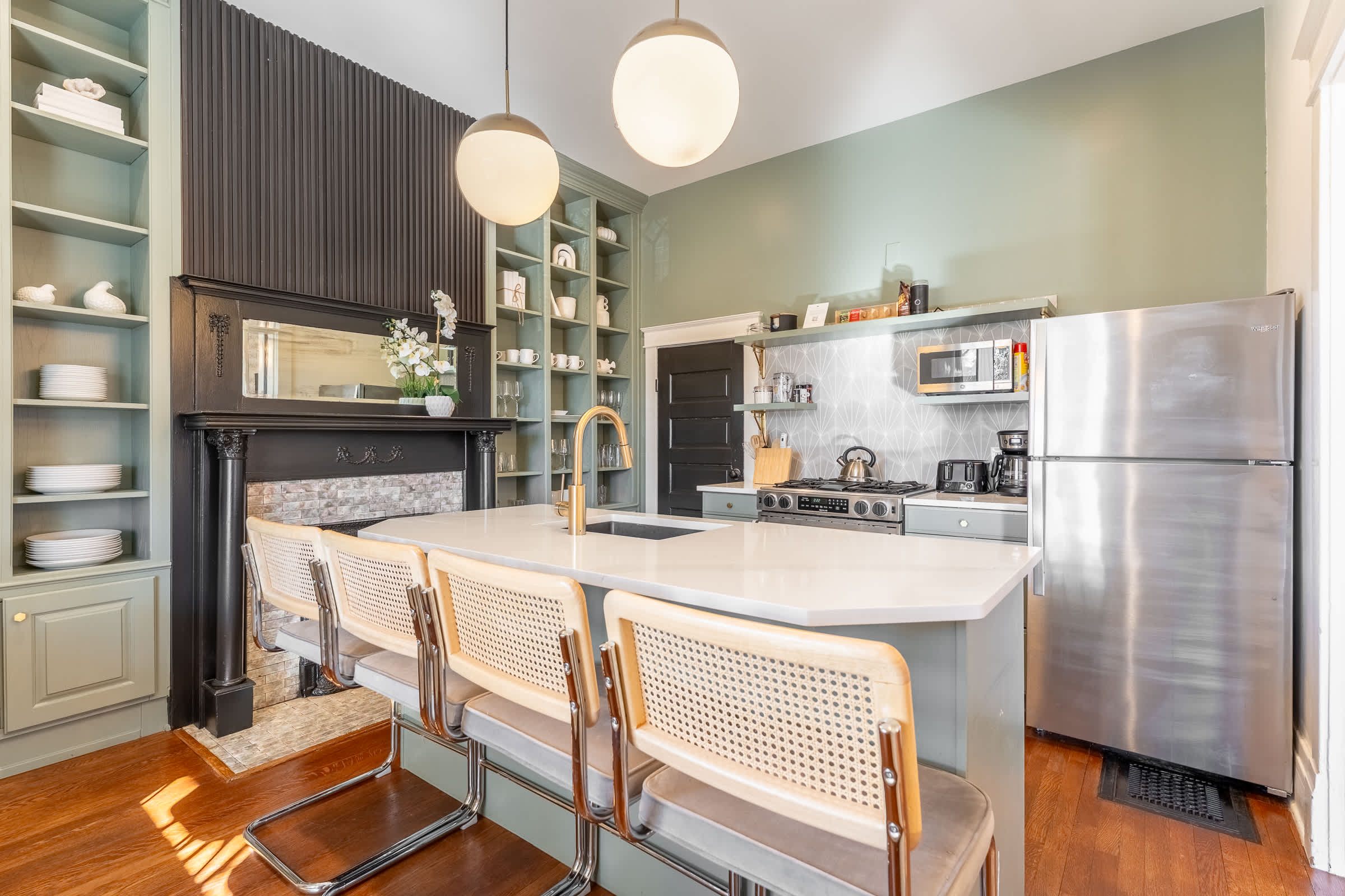 Kitchen & Living Area - The living area has plush seating and a smart TV. The beautiful kitchen is fully equipped with an island and two bar seating areas, ideal for cooking, gathering, or hosting your group before a night out.