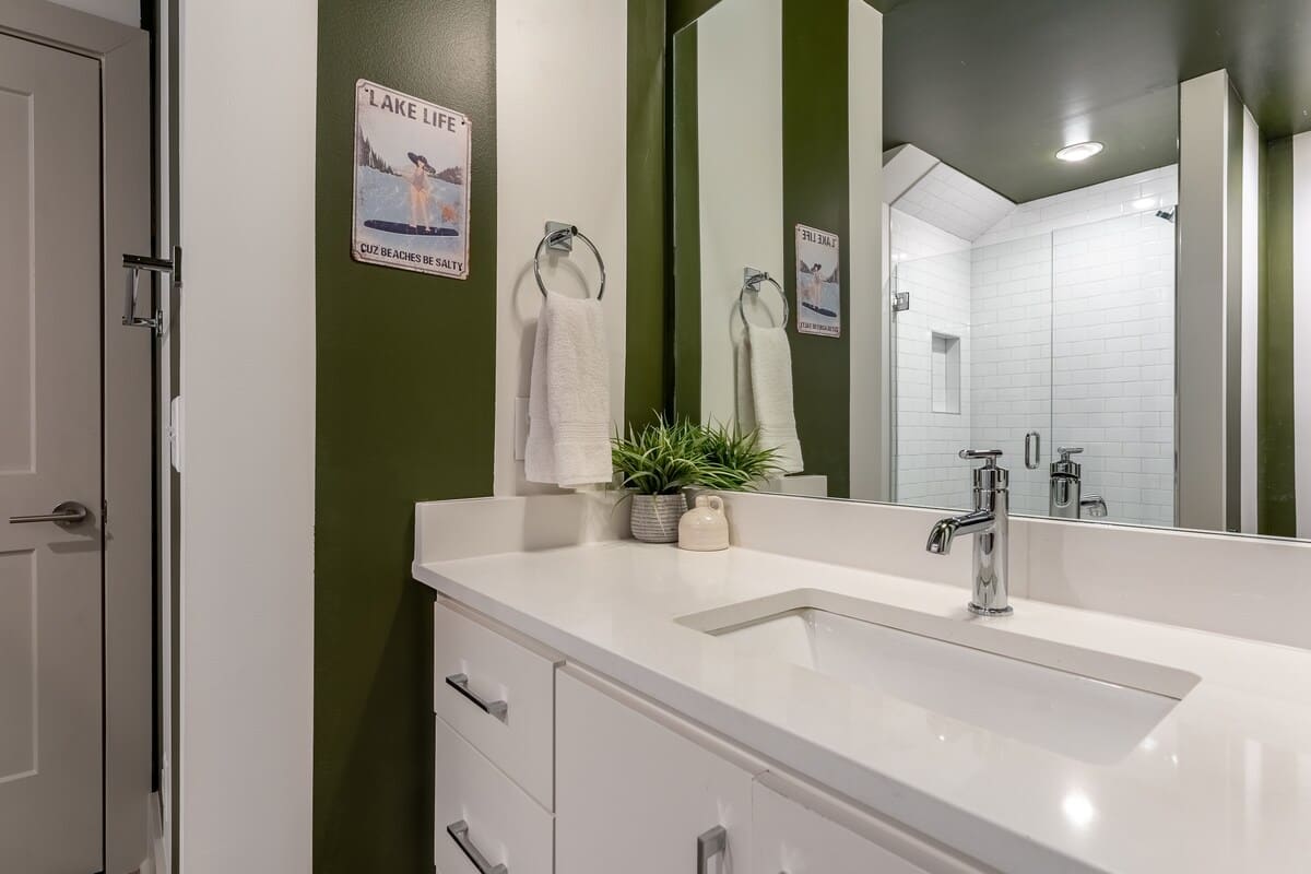 First (Lower) Level - common area with two queen beds, walk out covered patio, and en suite bathroom, with one sink and a walk-in shower. There is also a powder room in the staircase leading up to the main level.
