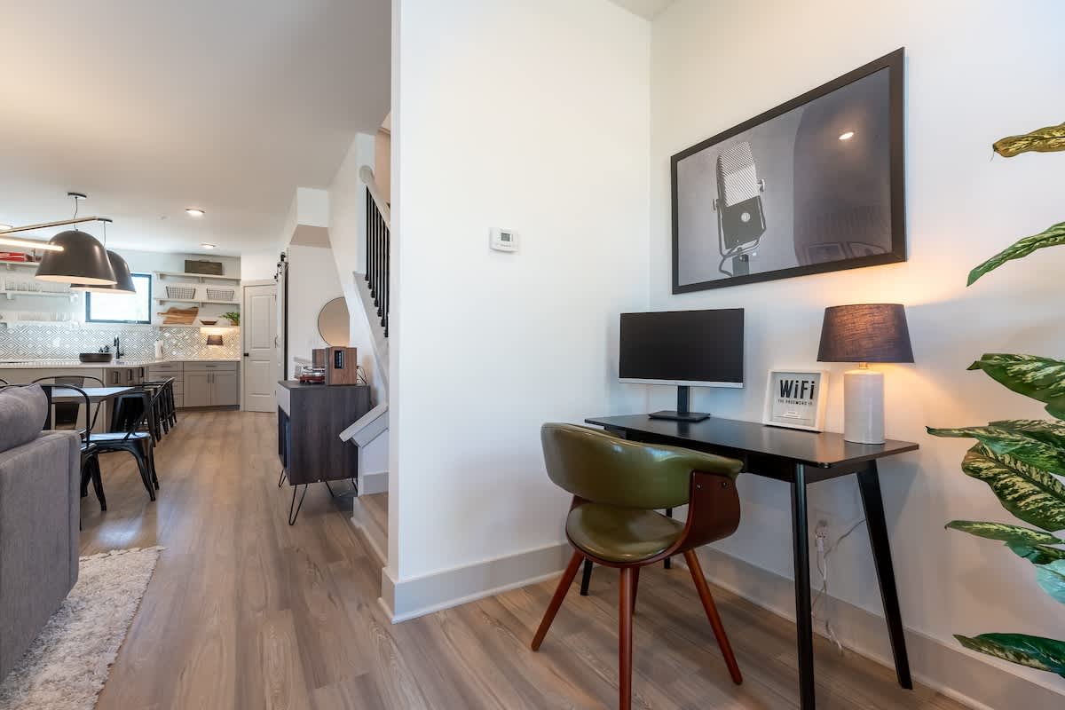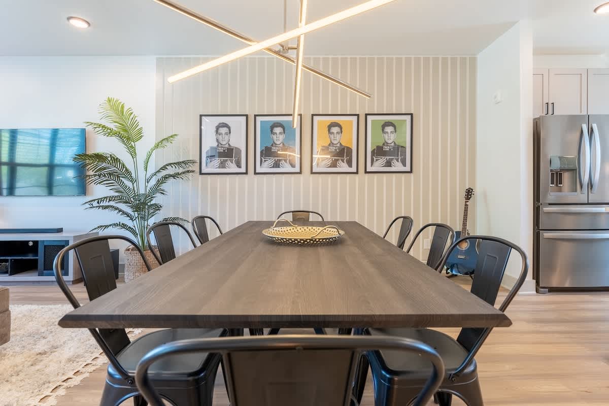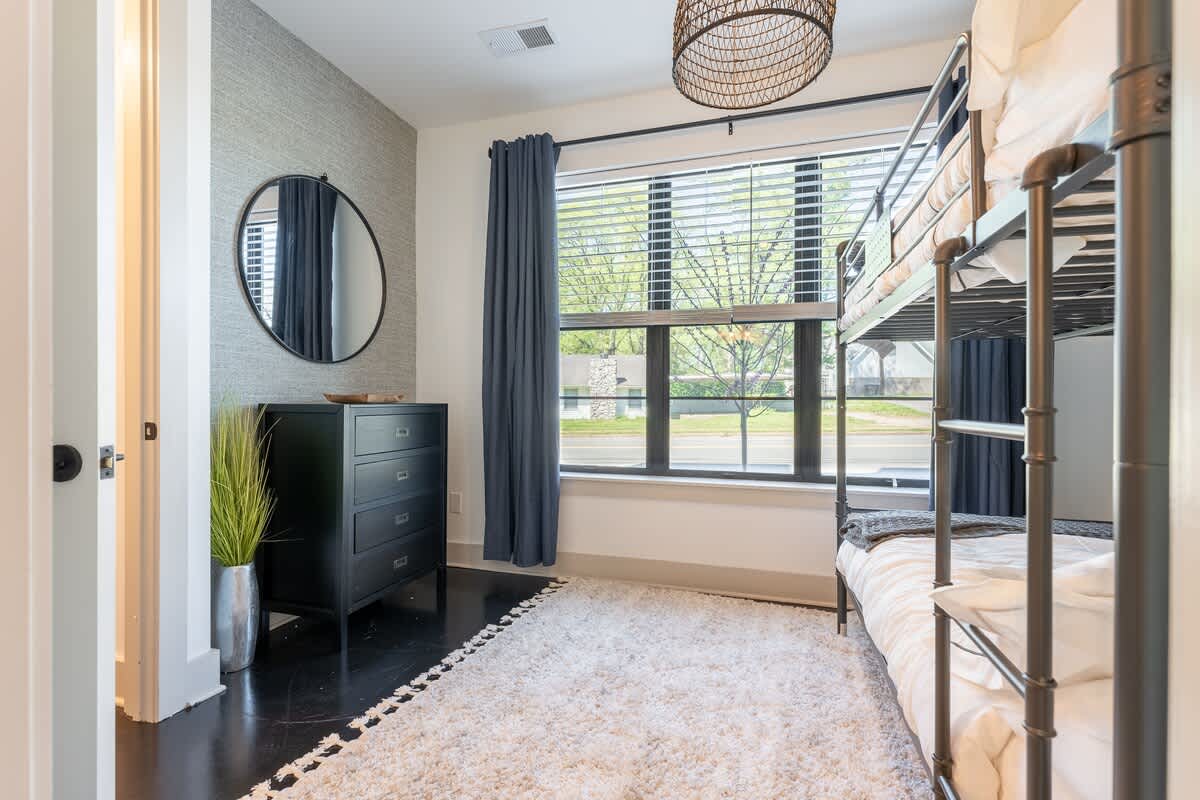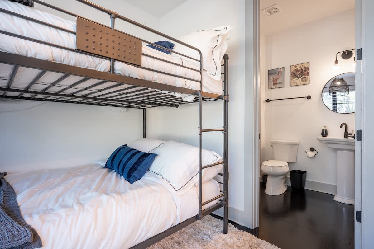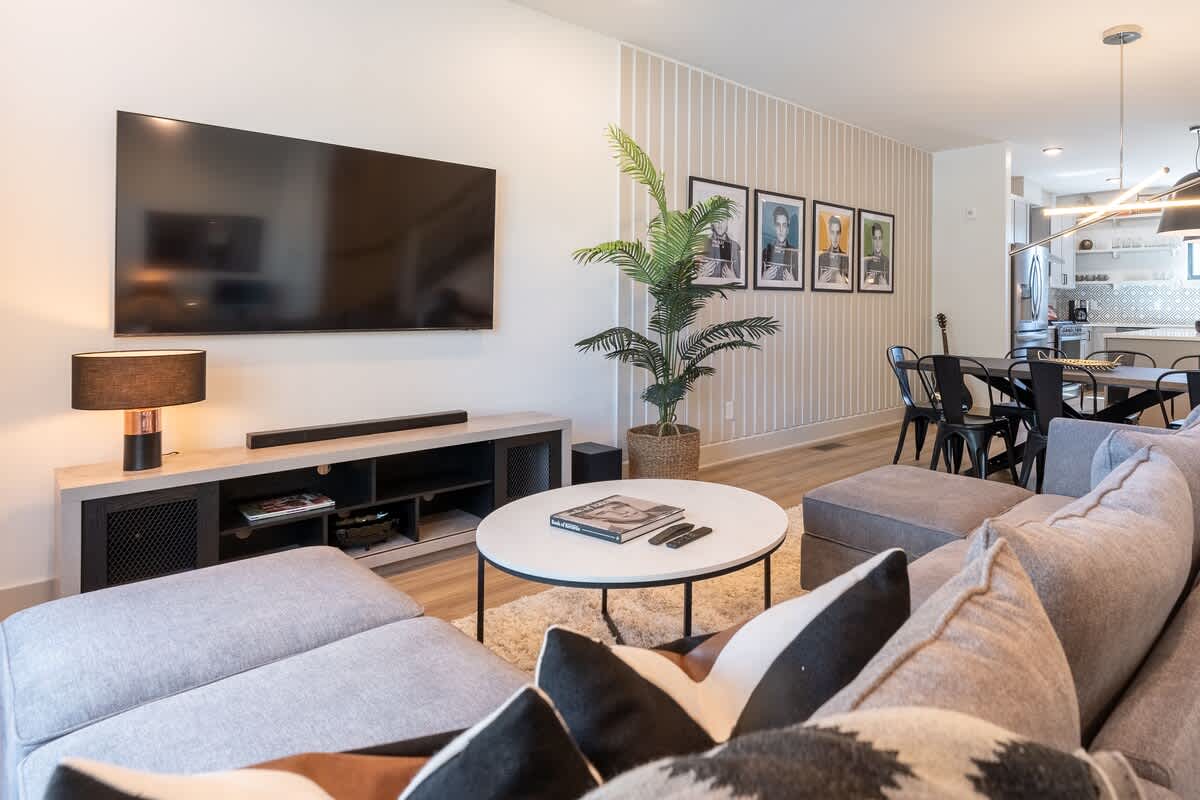 ★Welcome to The Jailhouse Rock★ This industrial modern townhome delivers an edgy aesthetic, luxurious open layout, and convenient location for the ultimate Nashville vacation experience. The multi-level space is made up of four cozy bedrooms, four and a half bathrooms, a trendy, rock-n-roll infused living area featuring hints of the King himself, and a show-stopping skyline view on the fourth level rooftop. Located just minutes from East Nashville Hotspots and Downtown Broadway, you’ll have the