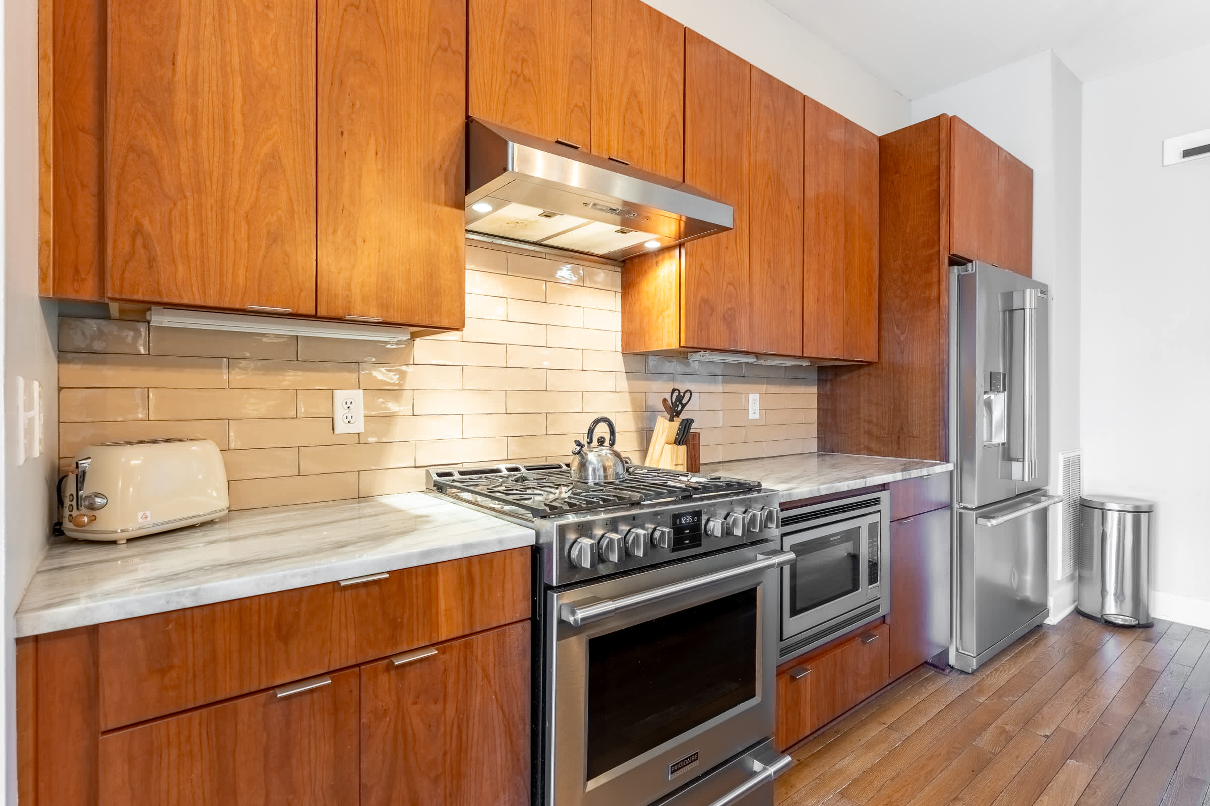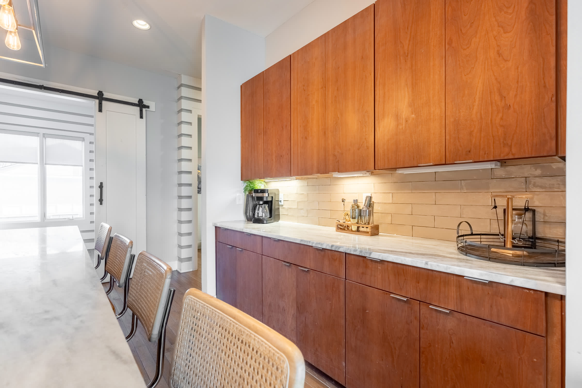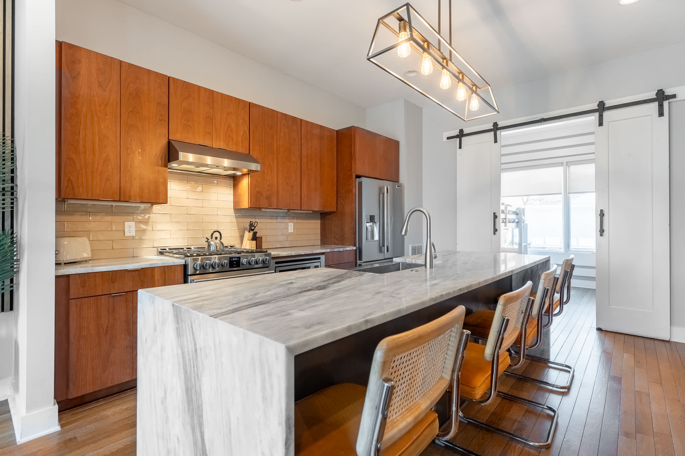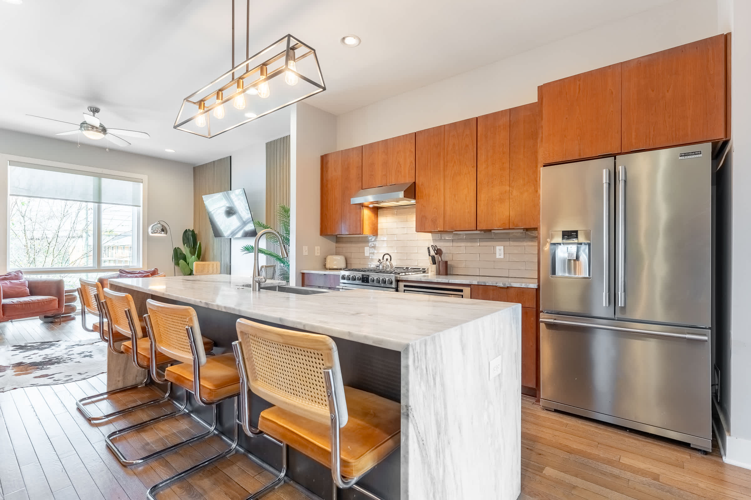 Kitchen & Living Area - The living area has plush seating and a smart TV. The beautiful modern kitchen is fully equipped with a large island and bar seating, ideal for cooking, gathering, or hosting your group before a night out.