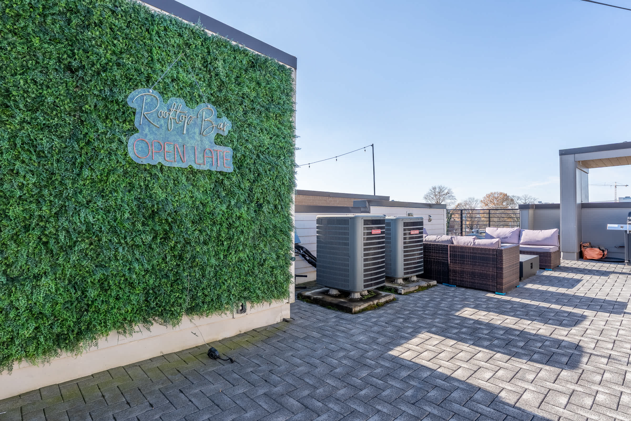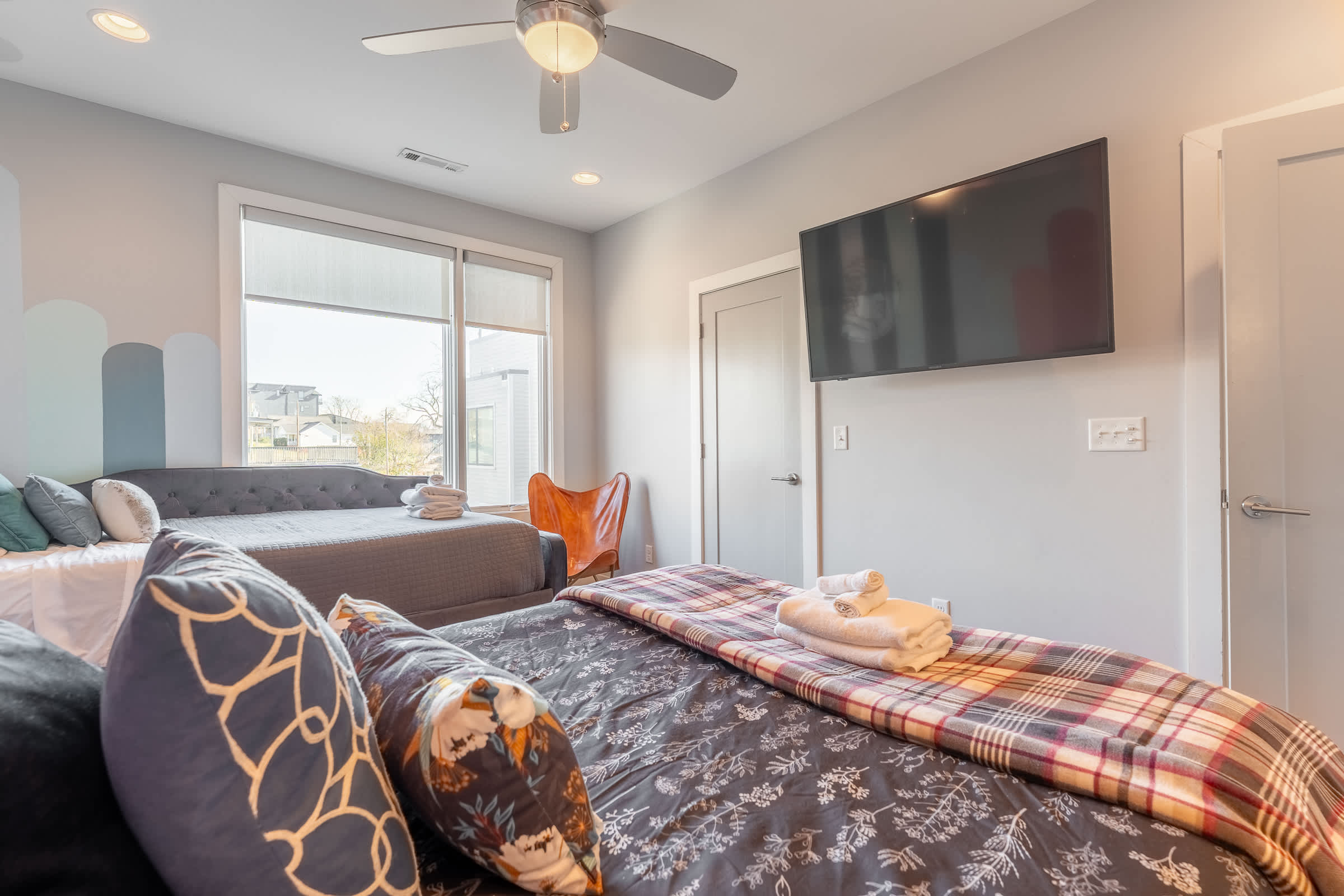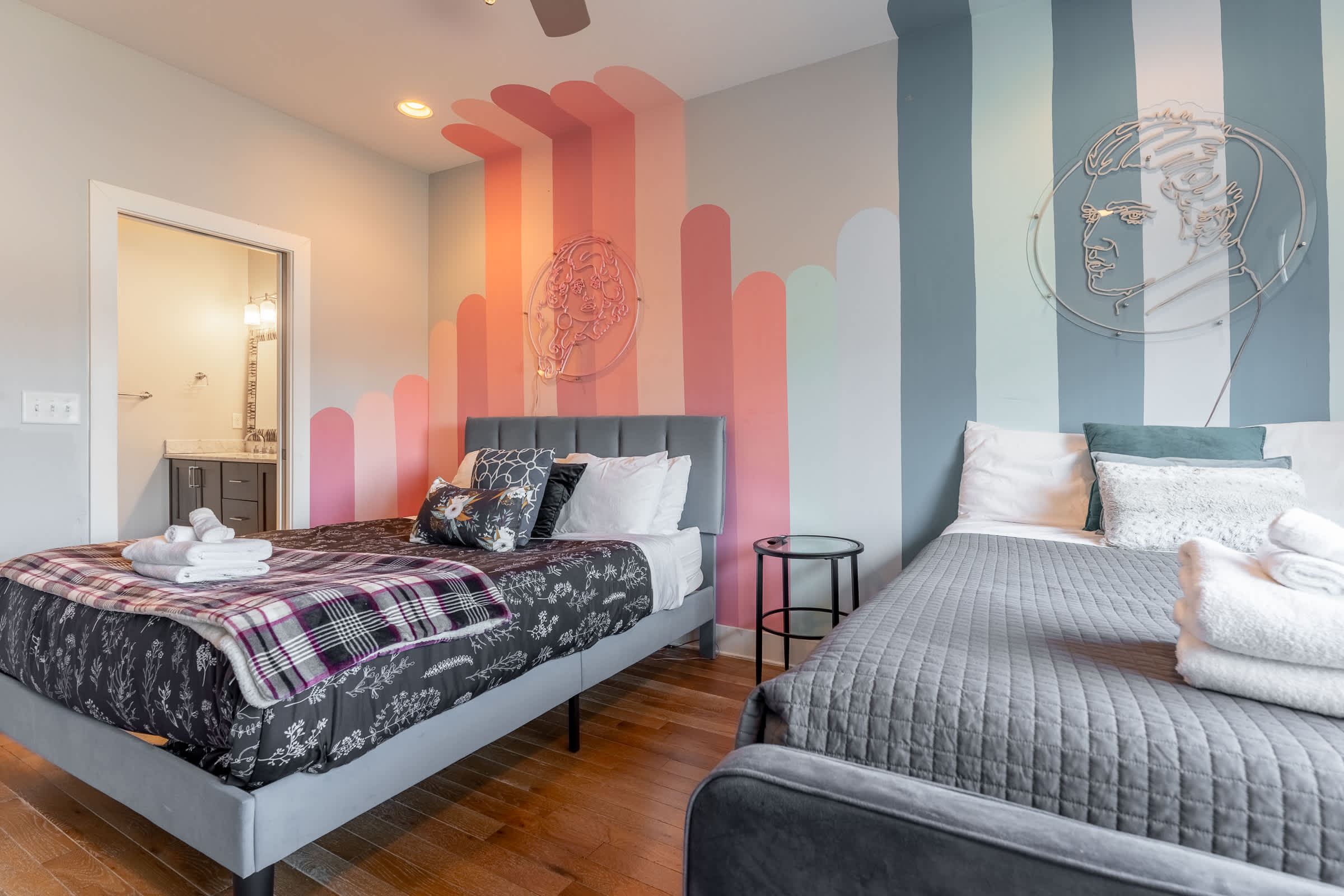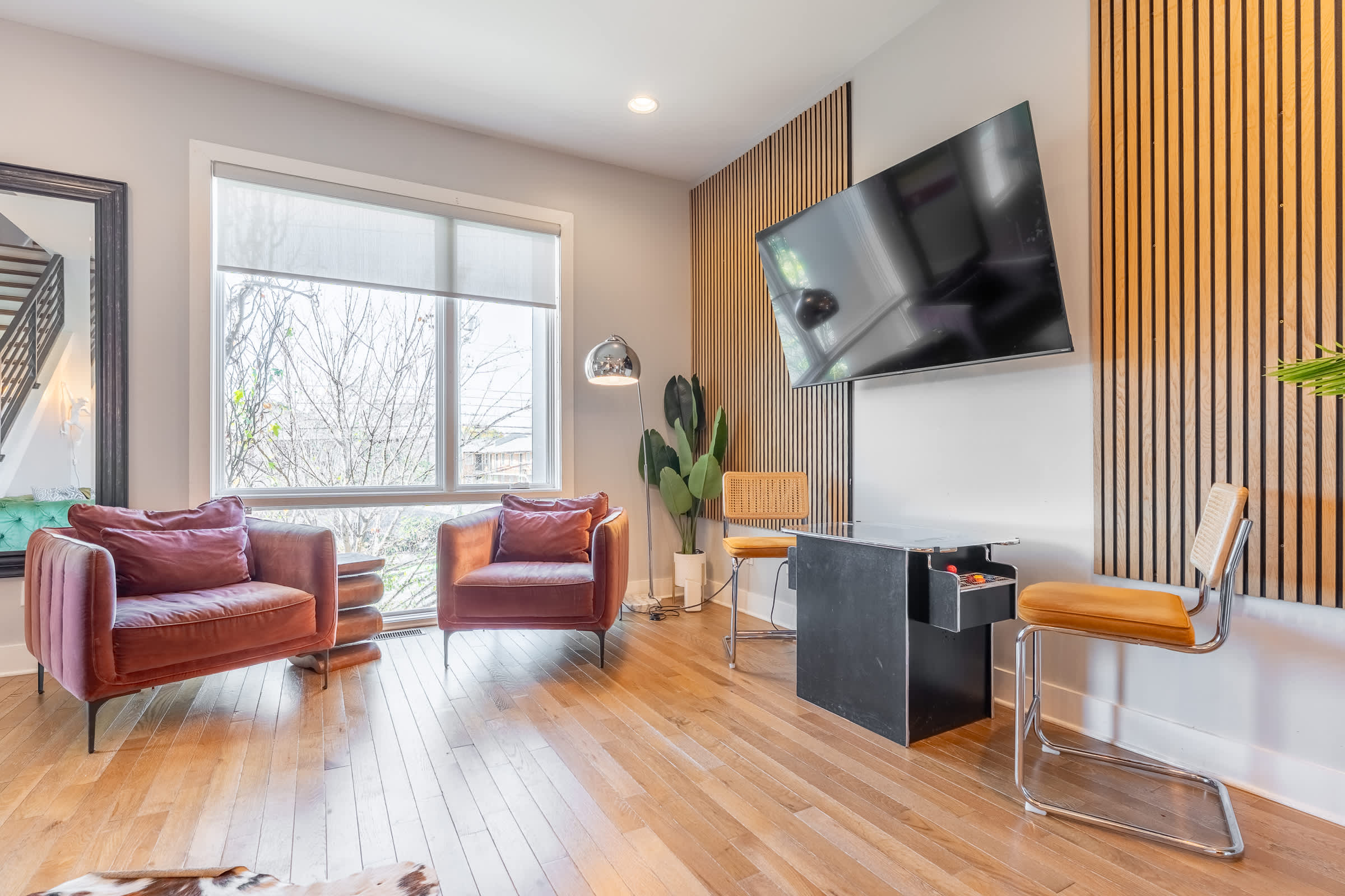 Kick things off on the private rooftop patio, where sweeping skyline views set the stage for sunset cocktails and late-night hangs. Cozy up around the fire pit under the stars before heading out, or, staying in! Inside, the energy continues, with a bright, modern living area that features retro arcade games, plush seating, and an open layout ideal for group gatherings. The fully equipped kitchen makes it easy to whip up meals, snacks, or pre-game drinks before exploring the city. With 4 spacious bedrooms and 3.5 bathrooms, there’s plenty of room for everyone to spread out and recharge after a night out. Thoughtful design and music-inspired touches keep the Nashville spirit alive in every corner of the ultra charming, Vivid Vocals!