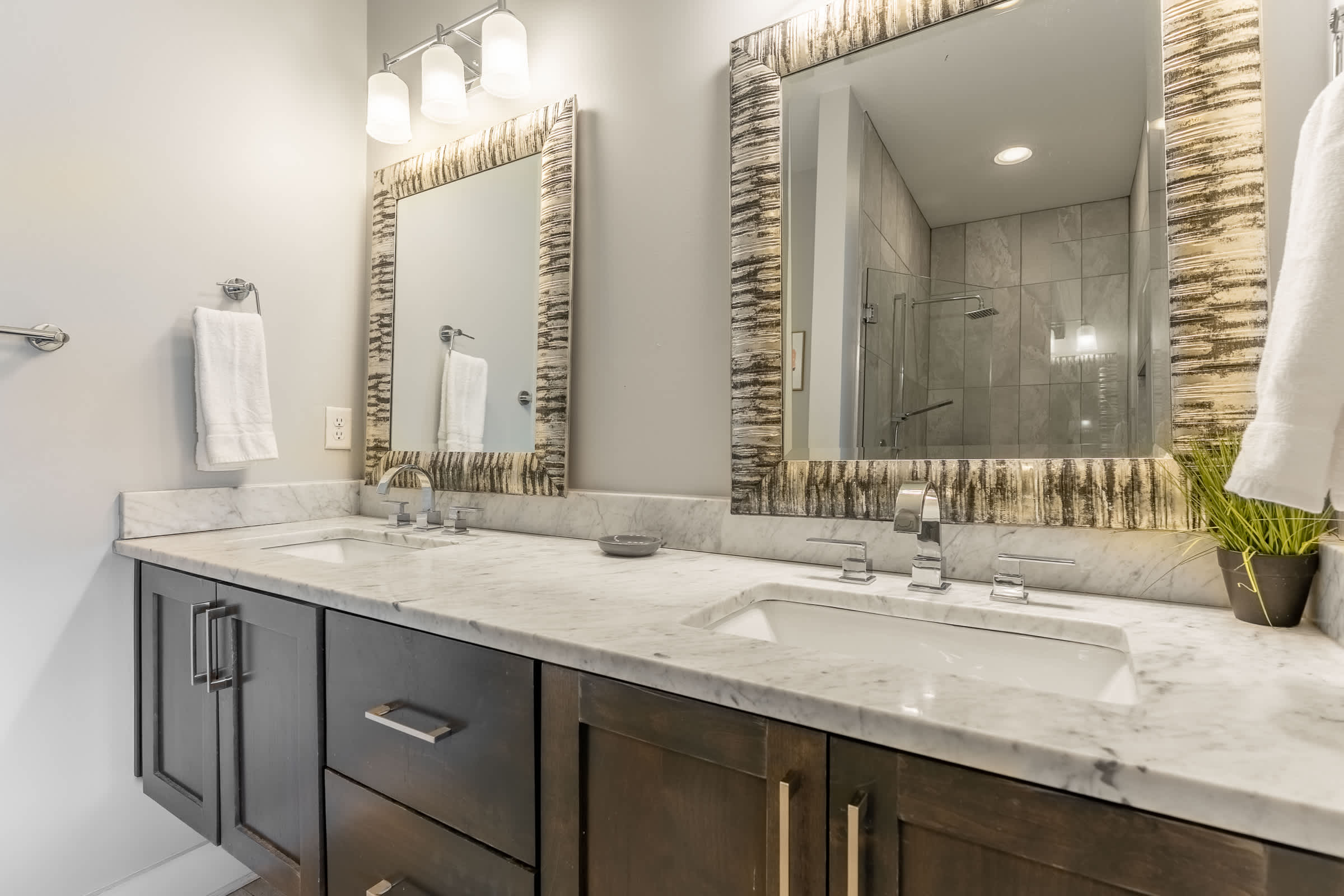 Bedroom Two - queen-over-queen bunk bed with a twin trundle, cozy furnishings, and en bathroom suite. Bathroom has single vanity with shower/tub combo.
